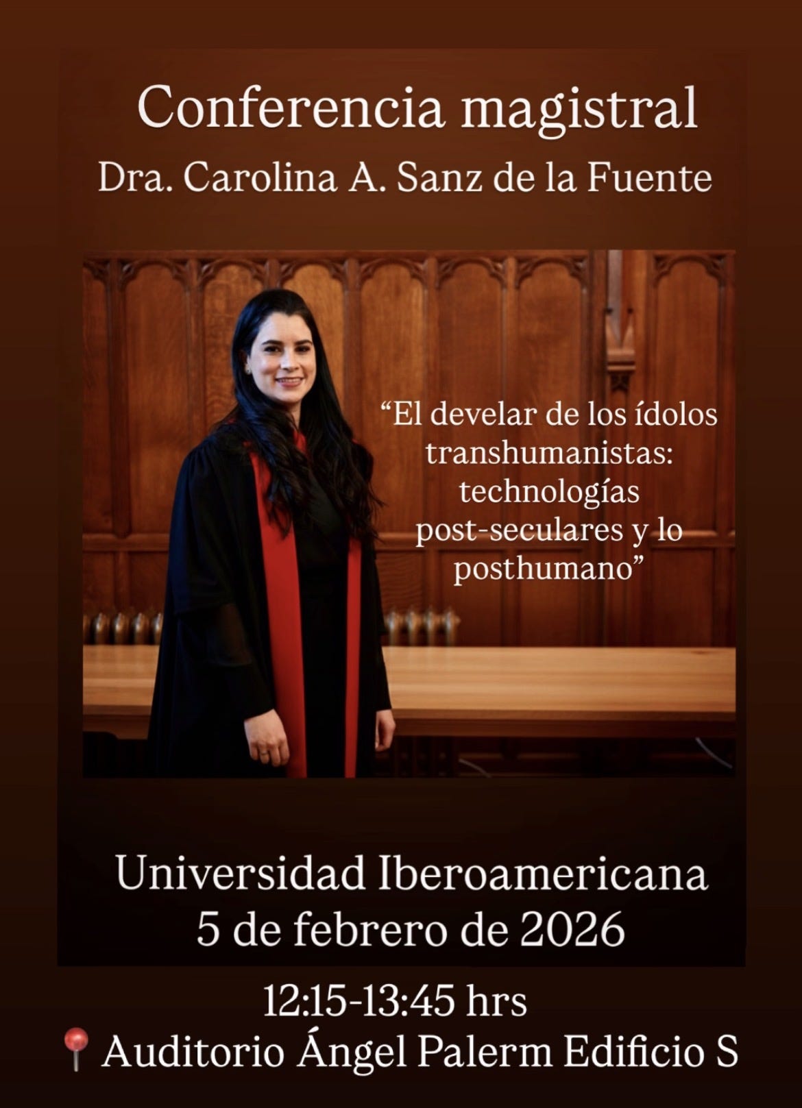 De La Fuente, Carolina A. Sanz. 2/5/2026. Revealing Idolatry: Transhumanism’s Posthuman and Post-Secular Technologies. Conference Keynote, “Encuentro de Ciberteologias y Posthumanismos Criticos”: Mexican Jesuit Universidad Iberoamericana.